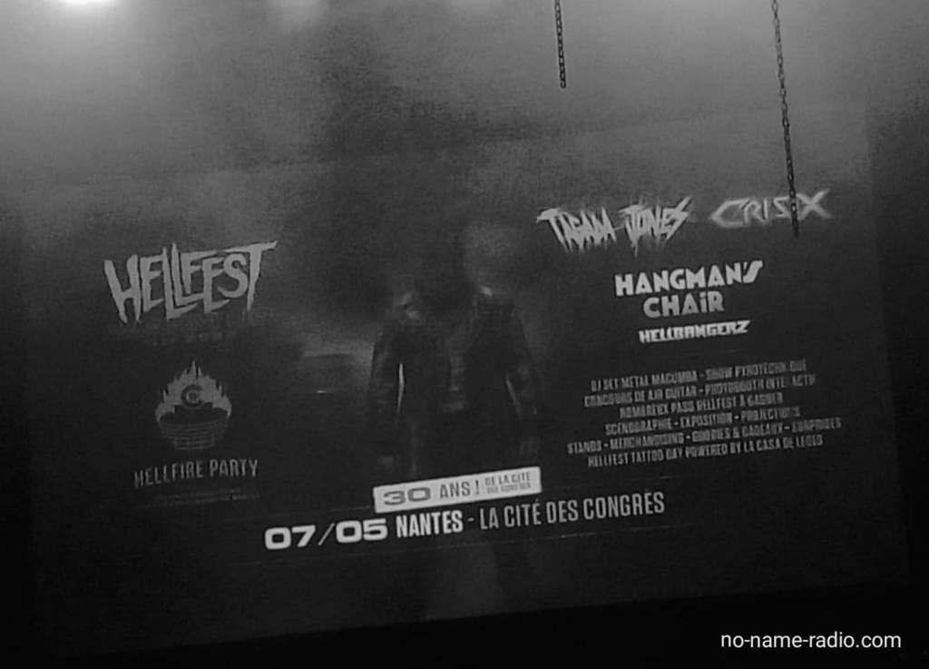 Côté décors le grand hall de la Cité des Congrès était aux couleurs du Hellfest, avec bannières et drapeaux, et côté public pas mal de personnes avaient fait le déplacement pour assister au prologue du voyage en enfer, dont le départ est prévu pour le 17 Juin prochain.