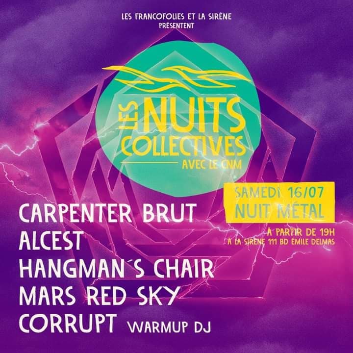 Le temps pour nous de récupérer à l’entrée du festival nos accréditations, de nous balader dans les coulisses du festival sous un soleil de plomb, nous priment ensuite la direction de La Sirène, assez excentrée de l‘Alexandrie Charentaise. Pour cette soirée placée dans le cadre des Nuits Collectives du festival, cinq groupes étaient programmés. Les natifs de Rochefort de Cörrupt, les bordelais de Mars Red Sky, les franciliens d‘Hangman‘s Chair, suivis d‘Alcest et de Carpenter Brut. Les deux dernières formations ne nous faisant pas frémir plus que ça, nous assisterons uniquement aux concerts des trois premiers groupes.