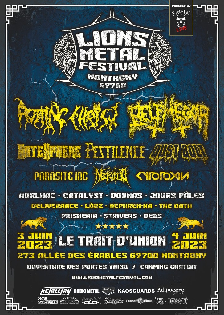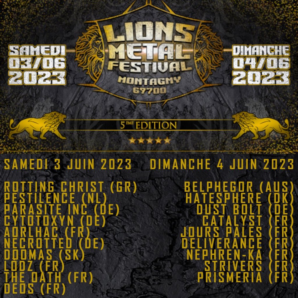 Pour les chanceux qui habitent en région Rhône-Alpes, il serait des plus judicieux d’aller faire un tours du côté de Montagny (sud de Lyon, direction Givors/St Etienne), lors du week-end des 3 et 4 Juin. Le motif en est des plus justifié, avec la cinquième édition du Lions Metal Festival et de son affiche de malade ! Pendant deux jours, 19 groupes vont se succéder, dont Lodz, Deliverance, Dust Bolt, Hatesphere, Cytotoxyn, Pestilence, Rotting Christ !
