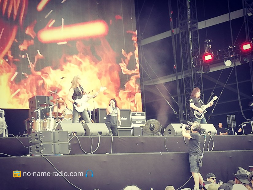 Une fois sortis de la fournaise de l’espace presse, nous voici de retour sur le terrain avec notamment le show très dancefloor des mexicaines de The Warning. J’avais vraiment hâte d’assister au show du trio, ayant en mémoire le live-stream de la presta vraiment excellente du Wacken de l’année passée, mais là rien, nada ! Quelque chose fait qu’il y a un truc qui prend pas, l’ensemble est sans relief, un peu plat pour moi, ce qui finit par me décevoir, et c’est vraiment dommage.