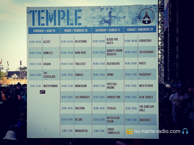 Entre temps, la chaleur s’invite de force sur le site de Clisson, les désoiffeurs arpentent les allées du festival et sont très sollicités. Les différents points d’eau, les fontaines de mur d’eau à l’effigie du Hellfest et la moindre parcelle d’ombre sont pris d’assaut. Les lances à incendie et mega brumisateurs n’en finissent pas de rafraîchir les festivaliers. Les sauveteurs en mer sont omniprésents et veillent sur le moindre m2, car oui, le public a très chaud !