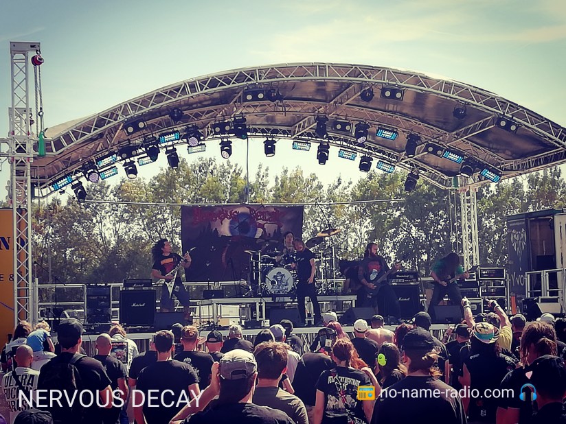 Juste histoire de faire le point de mon emploi du temps et de siroter un breuvage local, avec modération, en compagnie de mon ami Khermit Chris de France Metal, que le premier concert commence, avec les Nantais de Nervous Decay. Très bonne surprise, le combo distille un death-metal old-school qui assure vraiment bien. Si vous aimez le mighty Death époques « Leprosy » et « Human », c’est que du bonheur ! Mention spéciale pour la batteuse Alice Lesage, qui incarne un Sean Reinert en version féminine, impressionnante derrière ses fûts. A revoir on-stage dès que possible.